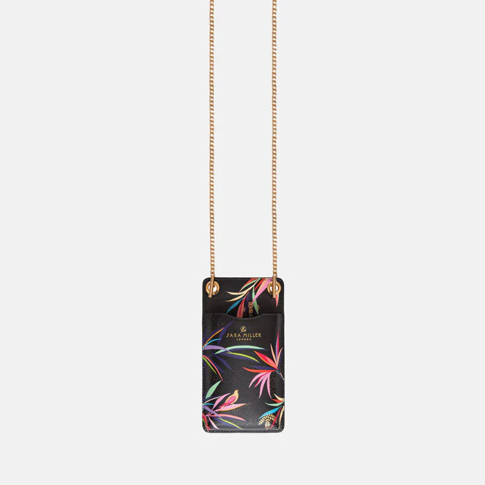Elevate your everyday with this Black Bamboo Phone Pouch from Sara Miller London's Tropical Collection. Practical and stylish, this phone pouch includes a slip pocket for your phone, with four compartments on the back to keep your cards safe and secure, as well as a chain strap to carry with ease. The eye-catching design, featuring exotic birds nestled amongst the colourful bamboo flora of an oriental garden, is complemented by intricate gold leaf detailing, set beautifully against saffiano embossed fabric ensuring your phone is protected on-the-go.