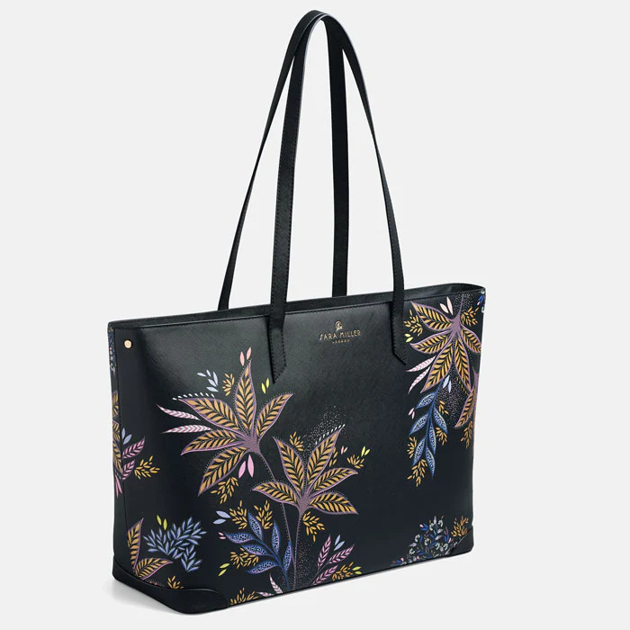 Turn heads with this generous-sized tote from Sara Miller London. A wearable and versatile print with dramatic oversized foliage in muted dusky tones, beautifully embellished with gold accents on a solid black background, this luxurious tote bag is perfect for carrying all your everyday essentials whilst adding a striking touch to any outfit.