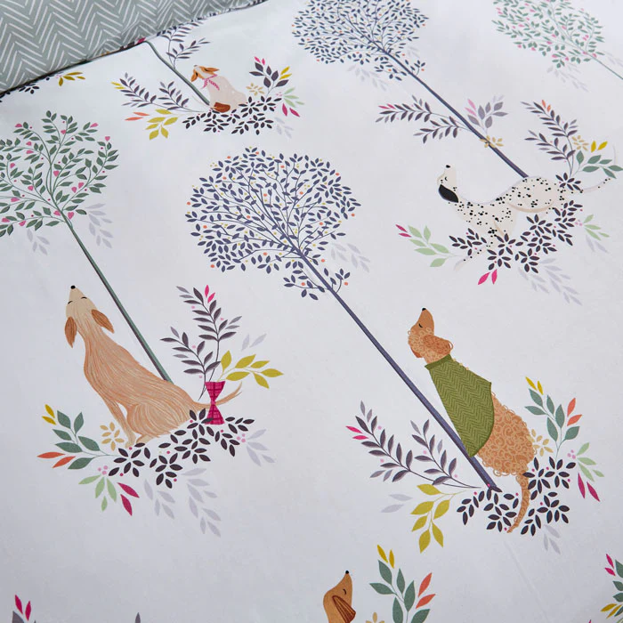 Discover the charming Dapper Dogs Bed Linen set from Sara Miller London, featuring an enchanting design of well-dressed dogs amidst a beautiful woodland scene. Printed on luxurious, plush 220 thread count 100% cotton sateen, this bedding offers a soft, breathable, and durable finish that ensures all-night comfort. The crisp white top contrasts elegantly with the coordinating soft green herringbone print on the reversible underside, adding versatile style and character to any bedroom.
