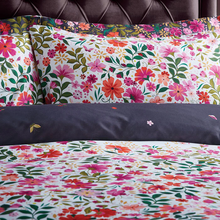 Sleep in style with the Ditsy Floral Bed Linen set from Sara Miller London, featuring an enchanting design of blossoms, butterflies, bees, and ladybirds. This luxury bed linen is reversible, showcasing a vibrant floral pattern on a deep mulberry base on one side and a fresh white backdrop on the other—perfect for refreshing your space with ease.