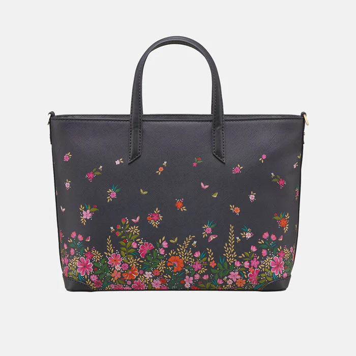 Add a delicate floral touch to your outfit with our Ditsy Floral Medium Tote from Sara Miller London. Perfect for carrying all your everyday essentials whilst adding a stylish touch to any outfit, adorned with bees, ladybirds and butterflies nestling amongst the pink and purple petals in full bloom on a deep ink base.